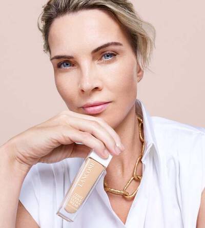 Teint Idole Ultra Wear Care & Glow Foundation brinda un brillo que resiste todo: se mantiene fresco todo el día sin transferirse, desvanecerse ni asentarse en líneas finas.